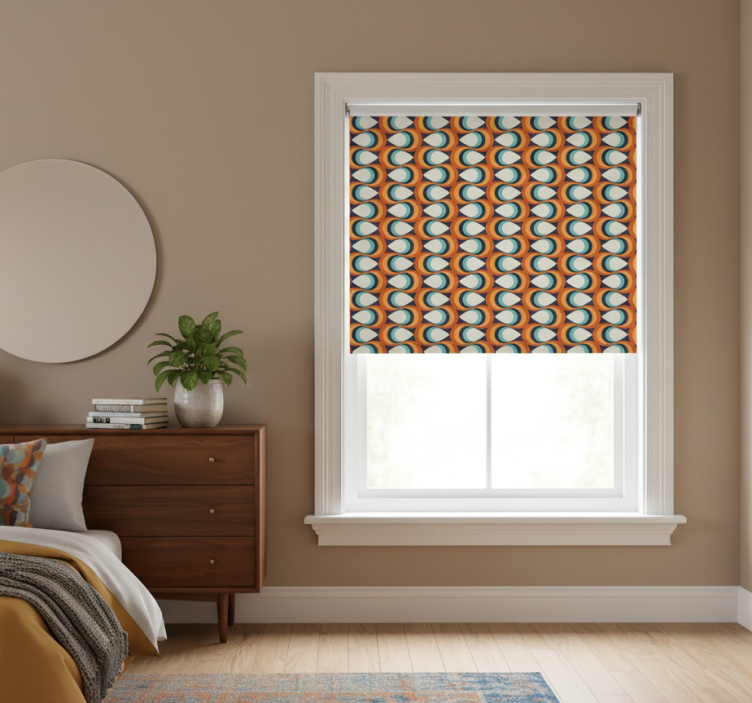 Reference: E9888Transform your living space with our stunning Bedroom roller blind with 70s pointed circles design. This delightful design features vibrant colors and playful pointed circles reminiscent of the 70s, bringing a touch of retro charm to your decor. Perfect for any bedroom, this roller blind not only enhances your interior style but also provides practical benefits such as protecting your room from direct sunlight and ensuring your privacy when lowered.