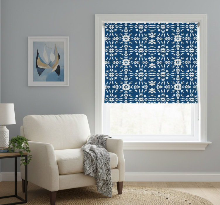 Blue roller blind with white tiled pattern
