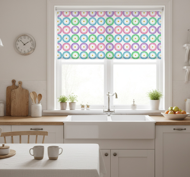 Transform your kitchen into a cozy haven with our Kitchen roller blind daisy pattern circles kitchen roller blind! This beautiful design effortlessly brightens up your space, making it an inspiring environment for cooking and entertaining. With its unique blend of functionality and style, this roller blind is the perfect choice for anyone looking to elevate their home decor while enjoying the practical benefits it offers!