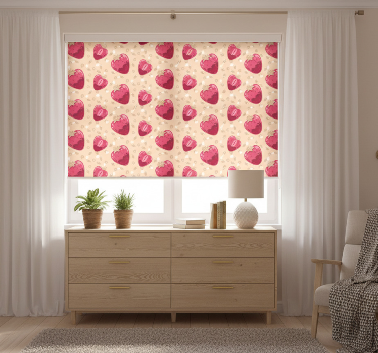 The Kitchen roller blind with strawberry pattern on beige kitchen roller blind enhances your kitchen's aesthetic, transforming it into a lively and vibrant space. The playful strawberry design adds a touch of nature and whimsy, making your kitchen not just a cooking area but a welcoming hub of creativity. Its unique look encourages a cheerful environment while ensuring practicality, making every meal prep a joyful experience!