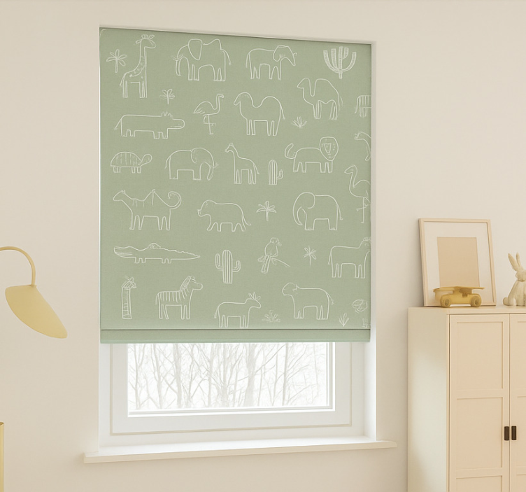 Reference: E6074Introducing our stunning Scandinavian roller blind jungle animals outline, a perfect blend of charm and functionality! This design features whimsical jungle animals outlined in a Scandinavian style, bringing a touch of nature indoors while enhancing your home decor. The playful yet elegant graphics create a delightful atmosphere for any room, making it an ideal choice for children's spaces or those young at heart.