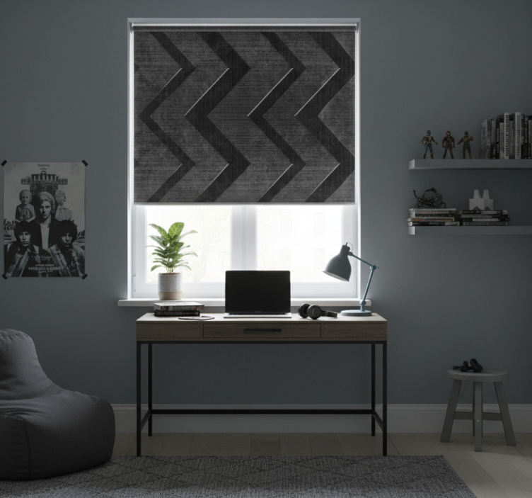 Reference: E7580Transform your space with our Teenage bedroom roller blind with black steel stripes, designed to elevate any room's aesthetic! This stunning roller blind features a modern black steel stripe pattern that effortlessly blends style with functionality. Not only does it enhance the visual appeal, but it also provides essential benefits like privacy and light control, making it a perfect choice for any teenage bedroom.