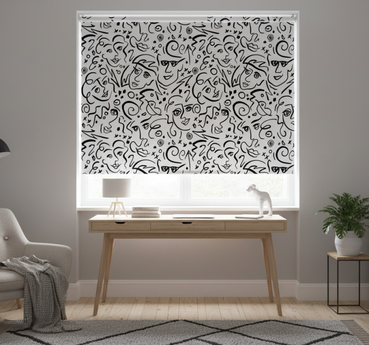 White roller blind featuring black and white graffiti art