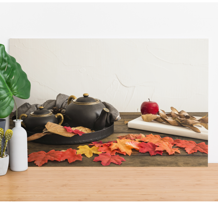 Immerse yourself in the cozy essence of autumn with our Autumn Tea Arrangement landscape canvas. This enchanting design features a rustic still life of teapots, a wooden board adorned with vibrant autumn leaves, and a crisp apple, all elegantly arranged on a charming table. The warm tones of the leaves and the inviting imagery create a serene atmosphere, perfect for enhancing any space in your home.