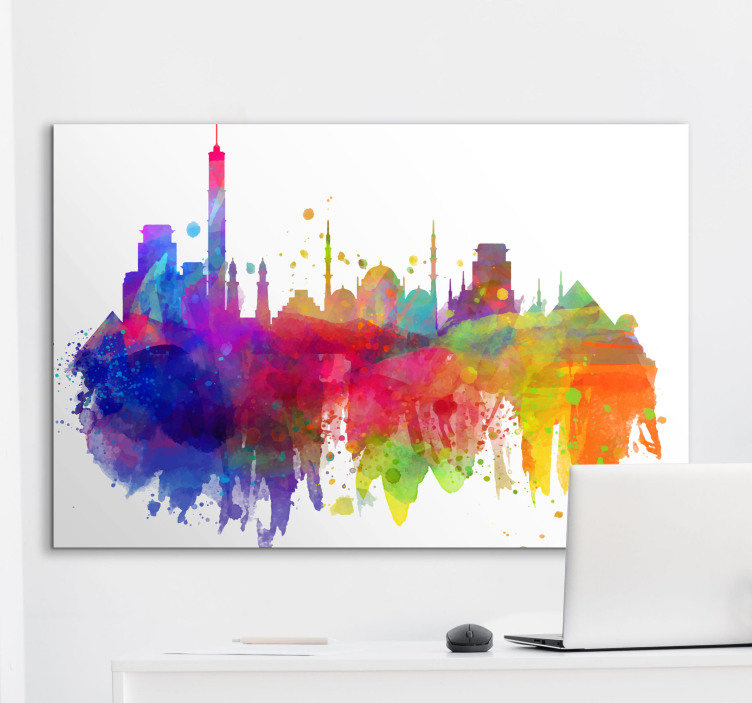 Step into a vibrant world of urban creativity with our Cityscape wall art colorful urban skyline. This stunning design features a breathtaking array of skyscrapers, expertly crafted in an abstract style that captures the essence of a bustling city. With splash and paint techniques reminiscent of watercolour painting, this artistic art piece brings an explosion of colourful life to any setting, transforming your space into an artistic oasis. Let this artwork serve as a mesmerizing backdrop that inspires and invigorates!