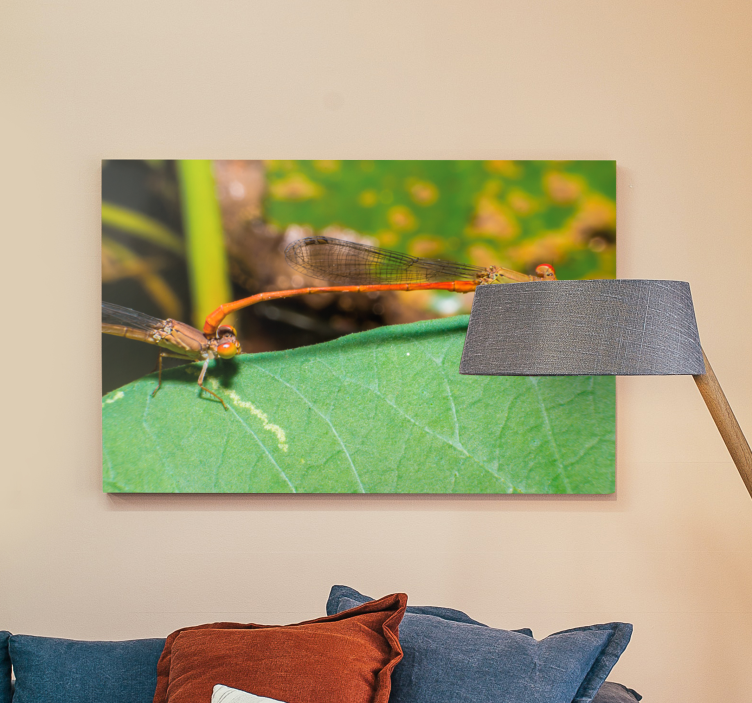 Immerse yourself in the tranquility of nature with our Dragonfly canvas pair of dragonflies. This stunning design features a captivating close-up of dragonflies gracefully perched on lush green leaves, capturing the essence of outdoor beauty and the delicate intricacies of these enchanting insects. The vibrant photography brings the serene ambiance of the natural world right into your living space, making it an ideal choice for nature lovers and art enthusiasts alike!