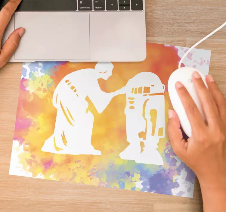 Introducing the Gaming mouse pad iconic robot interaction, a visually stunning piece that combines vibrant watercolor aesthetics with intricate illustrations. The design features a captivating sci-fi theme showcasing a colorful robot silhouette set against a cosmic backdrop, making it an artistic centerpiece for any gaming setup. Its interactive style invites gamers to immerse themselves in a futuristic world every time they sit down to play!
