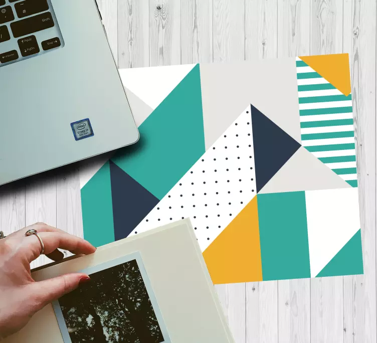 Reference: N3878This design features a vibrant arrangement of geometric shapes and patterns. The composition includes triangles and stripes in various colors, creating a visually striking effect that enhances any workspace. Bold and dynamic, this pattern captures attention and adds a contemporary touch.