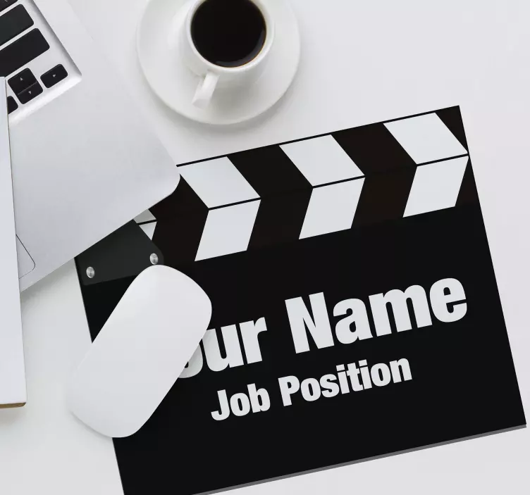 Transform your workspace with our Personalised mouse pad scene title card, a unique blend of style and functionality! This custom design features your name, job title, and favorite movie against a striking backdrop of black and white, complete with a clapperboard motif that evokes the magic of cinema. It's not just a mouse pad; it's a personal statement that adds character to your desk!