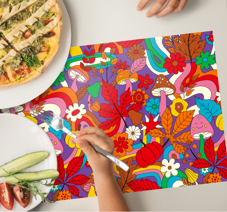 This design features a vibrant and colorful pattern of flowers, leaves, mushrooms, and lines on a purple background! It will instantly add a pop of color and liveliness to any space.