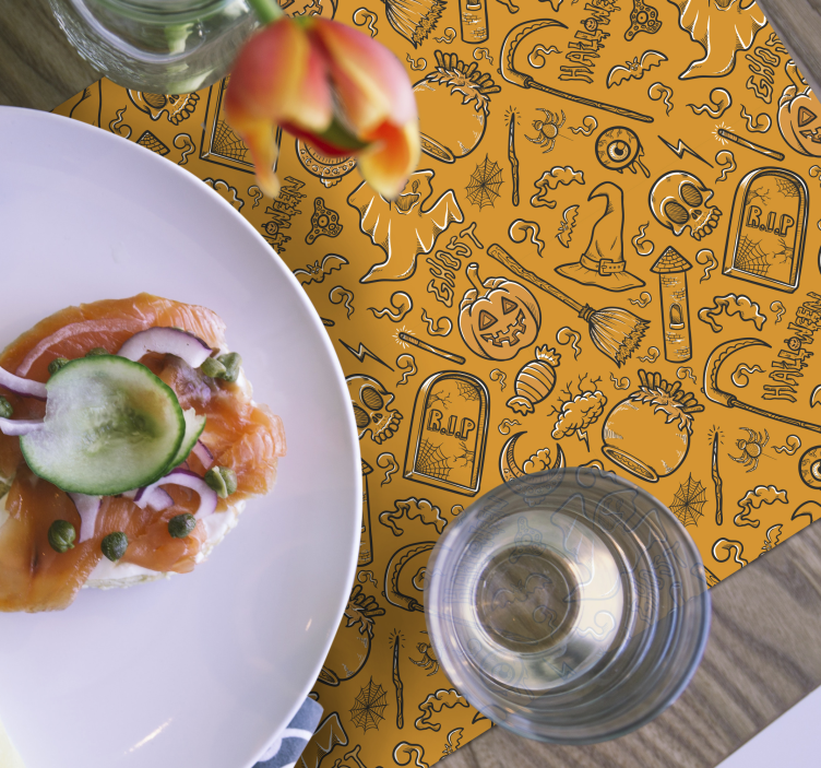 Get ready to elevate your Halloween celebrations with our Halloween placemats with eerie halloween designs! Each placemat features a striking pattern filled with vibrant drawings that perfectly capture the spirit of Halloween. With captivating designs of ghosts, skulls, pumpkins, spiders, and tombstones set against a lively orange backdrop, these placemats bring a delightful touch of spookiness to your dining experience. Perfect for setting the mood during your Halloween gatherings, they are sure to impress your guests!