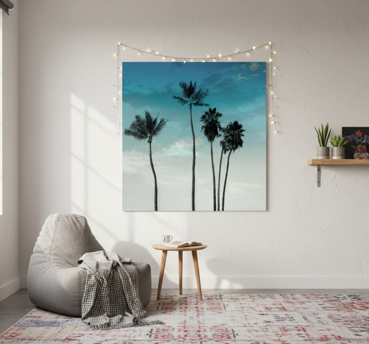 Reference: G788Transform your space with our stunning Living room poster with five tall palm trees design. This eye-catching piece features a vibrant depiction of five tall palm trees swaying gently against a serene backdrop. The rich colors and intricate details create a delightful visual experience, making it an ideal addition to any living room. Crafted with 180g/m2 grammage for durability, this semi-matt finish ensures no reflections interfere with the high color intensity, bringing nature's beauty right into your home!
