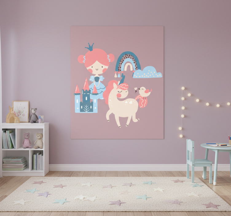 Transform your child's space into a fairytale wonderland with our Nursery poster with pastel unicorns and princesses nursery poster. This enchanting piece not only brightens up the room but also sparks imagination and joy in little ones. The playful themes of unicorns and princesses create a soothing atmosphere, perfect for inspiring sweet dreams and creativity during playtime. Let this beautiful artwork be the centerpiece of your nursery decor, creating a magical environment that your children will cherish!