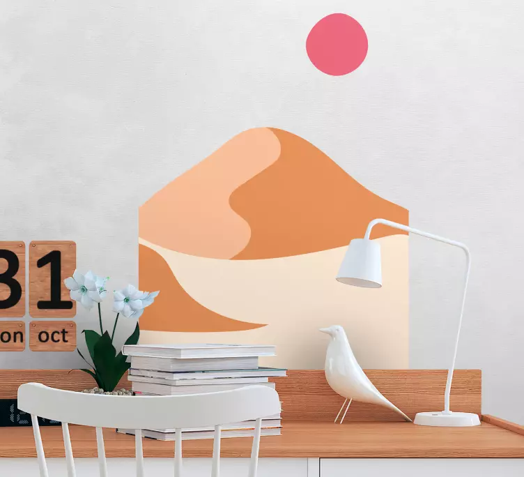 Transform your space with our stunning Abstract sand dunes decoration wall sticker, featuring a captivating design that beautifully combines elements of mountains, a radiant sun, and flowing sand dunes. This minimalist illustration evokes the essence of nature, inviting tranquility and serenity into any room. The abstract portrayal of these natural elements offers a unique artistic touch that enhances your decor!