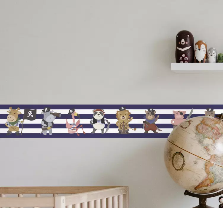 Reference: A47219A vibrant collection of pirate-themed animal characters showcased in playful postures. Each animal dons various pirate accessories, creating a delightful and adventurous atmosphere perfect for children's spaces. The design features stripes, adding a stylish nautical element to the overall theme.