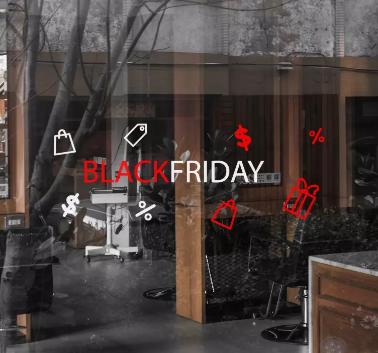 Get your business ready for Black Friday with this Black Friday Icons Window Decal! This wonderful sticker features the text 'Black Friday' surrounded by various icons including shopping bags, percentage signs, presents, and dollar signs. The decal is colored in white and red to reflect how good the sale is!