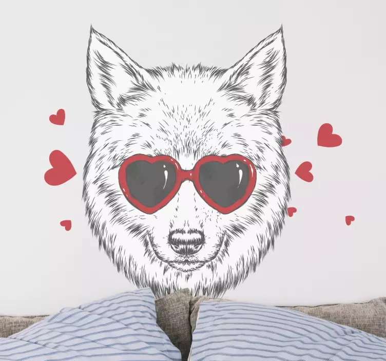 Reference: A47972A charming representation of a wolf wearing heart-shaped sunglasses, radiating a fun and affectionate vibe. The surrounding hearts enhance its playful nature, making it a delightful choice for adding character to any space.