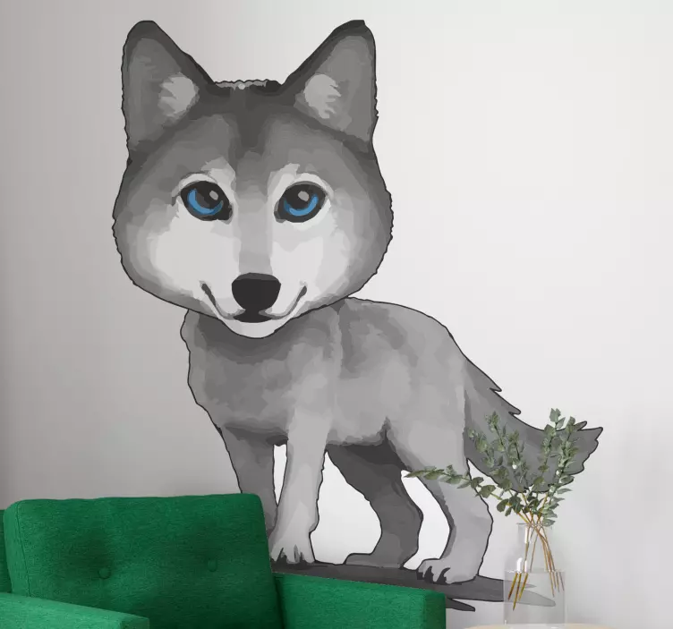 Reference: A46936A playful wolf character with striking blue eyes stands confidently, capturing attention with its adorable expression. The design showcases the wolf's charming features, making it a delightful focal point, perfect for animal lovers and those looking to add a touch of whimsy to their space.