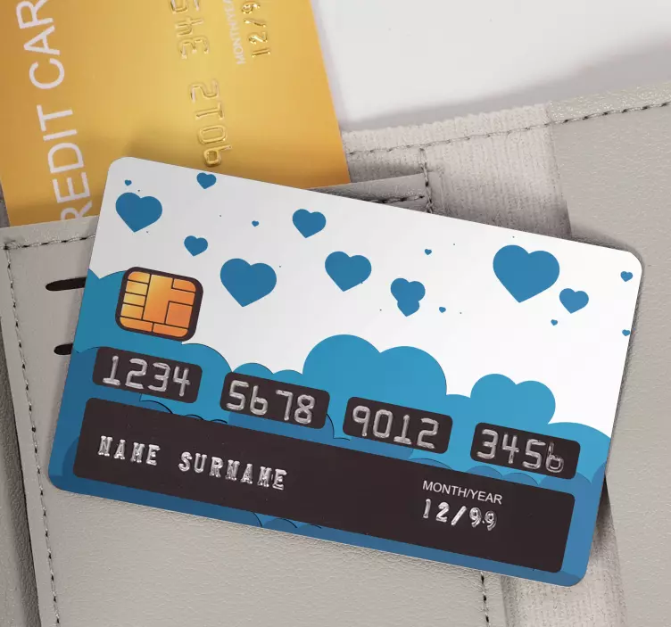 Introducing our Credit card sticker cloud hearts design, a delightful way to express your love and creativity! This playful sticker features an enchanting design of blue clouds dotted with charming hearts. Perfect for adding a touch of personality to your credit card, this sticker transforms your card into a beautiful representation of love.