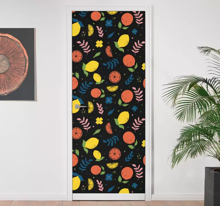 Brighten up your space with our door sticker with colorful citrus designs! Featuring an eye-catching pattern of vibrant oranges and lemons against a sleek black background, this adhesive graphic design brings the essence of fresh fruits to your door. The stunning floral illustrations create a lively atmosphere in any room, making your door a focal point that radiates cheerfulness and creativity.