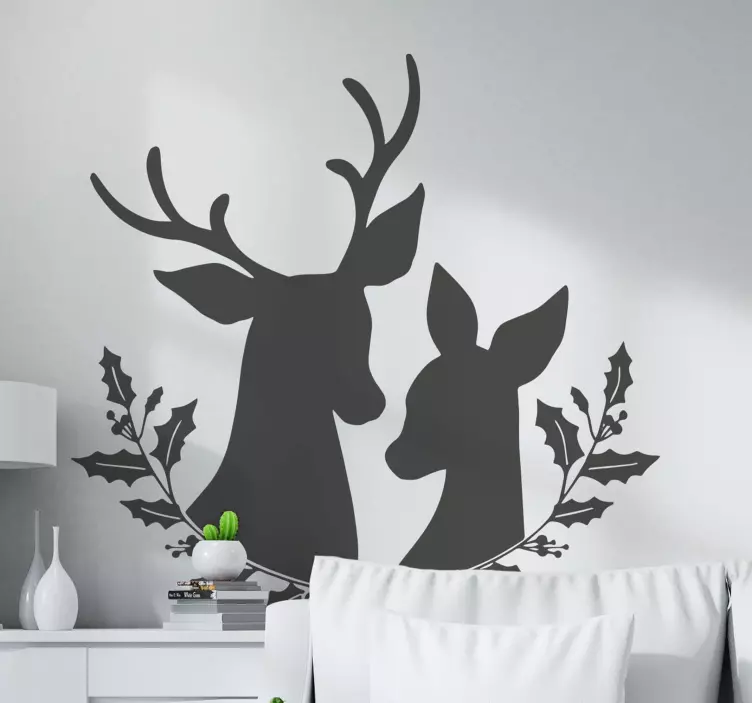 Reference: A46840A charming depiction of two deer featuring intricate antlers and gentle expressions, framed by holly branches. This design evokes a sense of warmth and connection to nature, perfect for transforming any space into a serene and inviting environment.