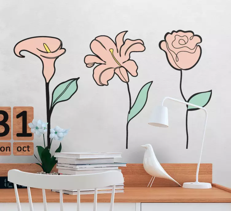Transform your space with our Flower wall sticker graceful blossom arrangement, a stunning depiction of elegant flowers that captures the beauty of nature. The delicate drawings in pastel colors create a decorative atmosphere, making it a perfect addition to any room. This botanical design will bring a sense of tranquility and sophistication to your home!