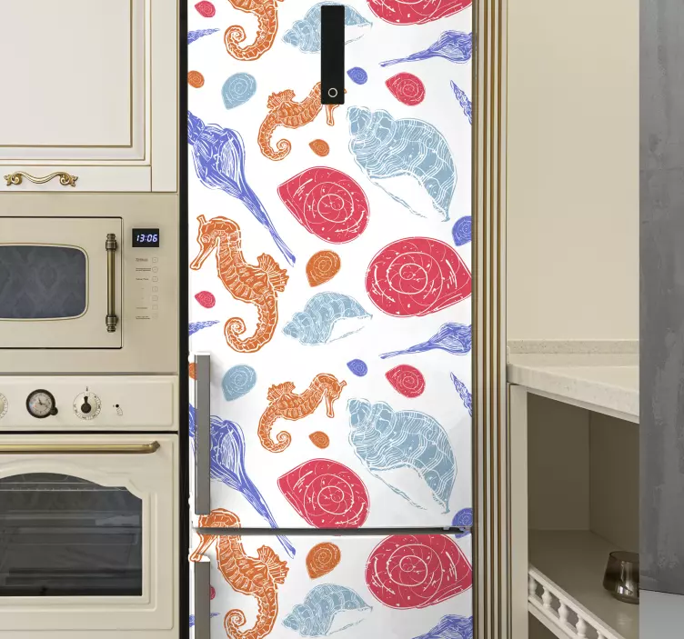Brighten up your kitchen with our Fridge sticker seahorse and shells design that captures the essence of the sea! This playful and colorful pattern features delightful seahorses and seashells, embodying the vibrant marine life and aquatic beauty that can transform any dull appliance into a cheerful focal point.