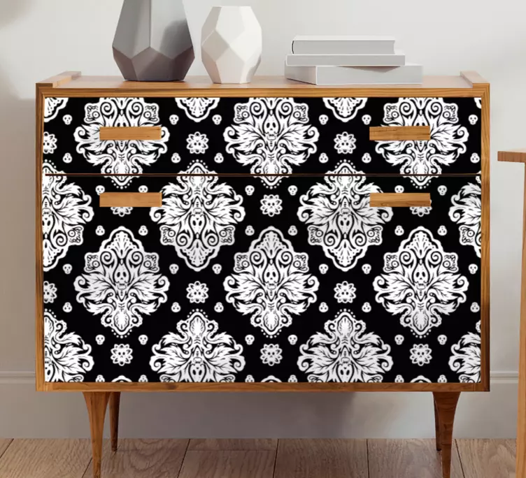 Transform your living space with our Furniture sticker elegant pattern design, featuring an exquisite blend of skulls, florals, and damask elements. This ornate black and white pattern embodies a modern style, perfect for any home interior. The intricate furniture design elevates your décor, making it both striking and sophisticated!