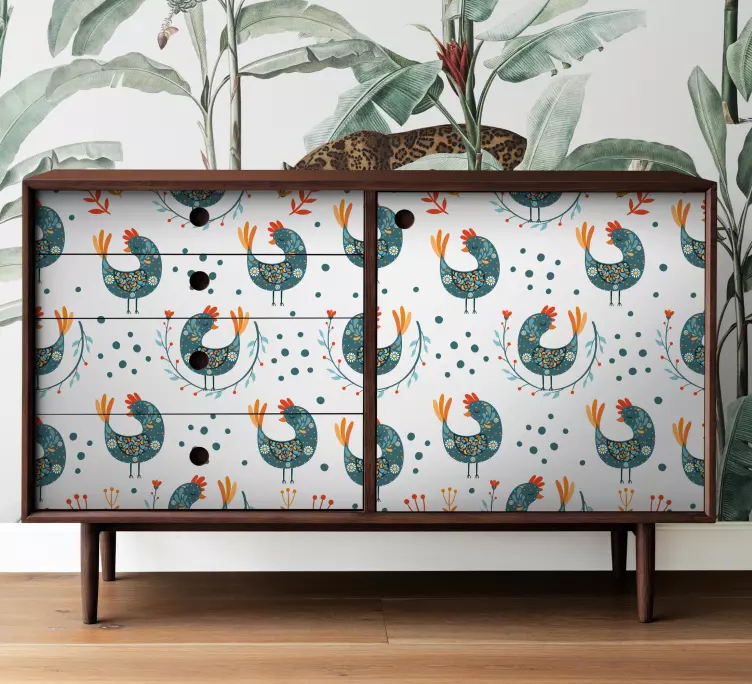 Introducing our vibrant Furniture sticker lively rooster design, a charming illustration that features playful chickens and farm animals surrounded by a floral pattern. This colorful design brings a touch of whimsy to your furniture, transforming ordinary spaces into delightful havens of creativity!