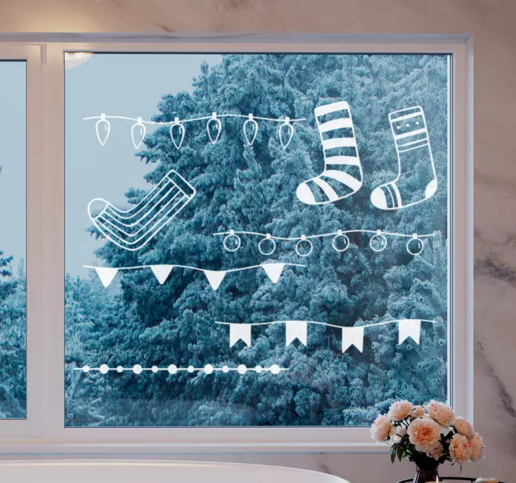 Transform your space this festive season with our Holiday sticker holiday sock showcase. This vibrant design features delightful stockings, cheerful socks, and enchanting ornaments, all beautifully arranged amidst a backdrop of twinkling lights and festive garlands. Perfect for creating a warm holiday atmosphere, this window sticker brings the joy of Christmas right into your home!