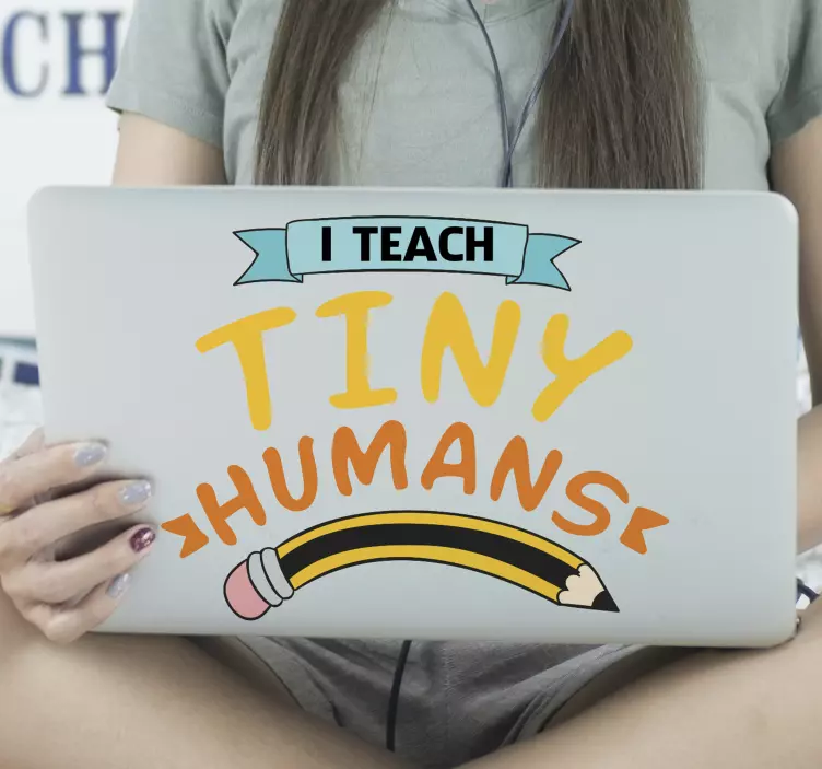 If you're a passionate teacher, you'll love this educational teacher's vinyl laptop decal featuring the text "I teach tiny humans" and an adorable pencil illustration. Express your love for teaching with this simple teacher's laptop decal.