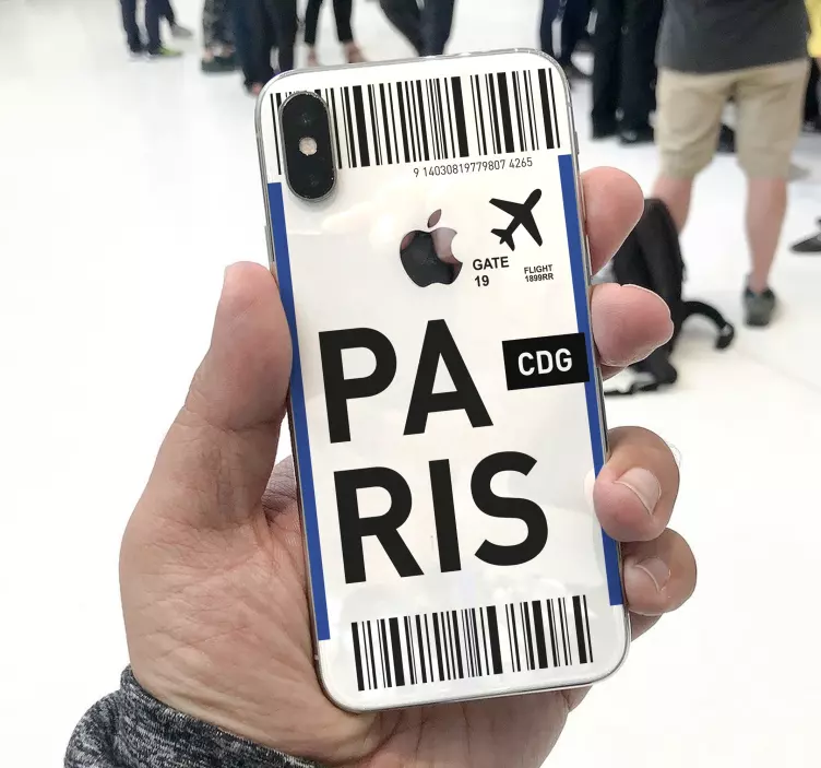 Introducing our Iphone sticker flight ticket Paris, a stunning design that captures the essence of travel! Featuring elements like the iconic Paris skyline, a sleek plane, and the unmistakable look of a ticket, this sticker is perfect for any travel enthusiast. With a charming mix of text, airport vibes, and even a barcode, it tells a story of adventure right from your phone!
