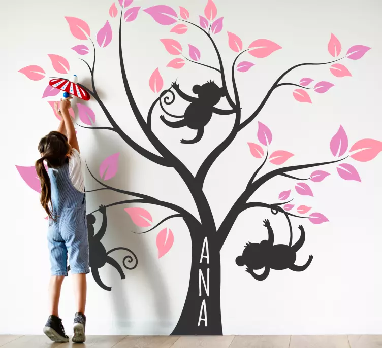 Reference: A48289A vibrant design featuring playful monkeys hanging from a tree with pink leaves. This customizable piece adds a cheerful touch to any space, making it perfect for children's rooms. It encourages imagination and adventure in a joyful atmosphere.