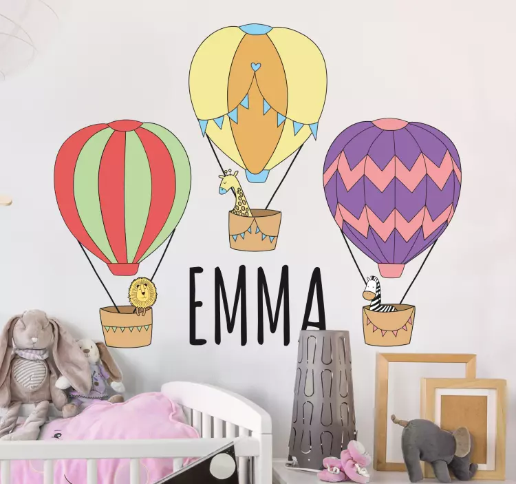 Transform your child's room into a world of fun and adventure with our Kid's sticker lively hot air balloons. This delightful design features colorful hot air balloons soaring through the sky, accompanied by adorable animals, creating a whimsical atmosphere. Each sticker can be personalized with a custom name, making it a unique addition to your child's space. Perfect for any children's room, this illustration captures the essence of exploration and imagination.