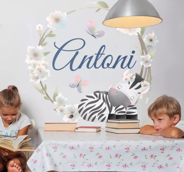Introducing our Kid's sticker zebra floral design, a delightful fusion of playful zebras and vibrant flowers! This whimsical design is perfect for children, creating a cheerful atmosphere wherever it is placed. The customisable feature allows you to add a name in elegant calligraphy, framed by a charming wreath. Your little ones will adore the cute zebra and the colorful floral elements that truly bring their space to life.