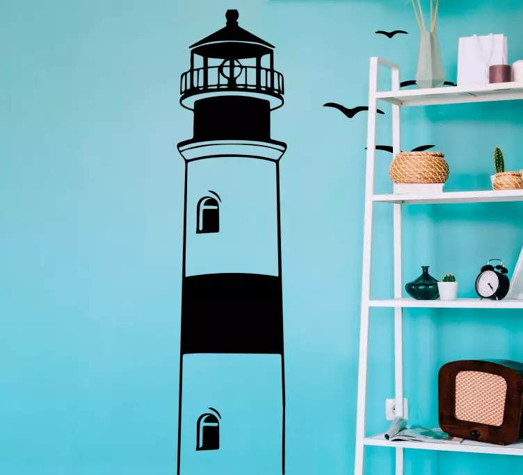 Transform your space with our Location sticker lighthouse silhouette design! This stunning graphic features a beautiful lighthouse surrounded by graceful birds, creating a perfect nautical and coastal ambiance for your home decor. The silhouette style adds a touch of elegance, making it a unique and captivating addition to any room.