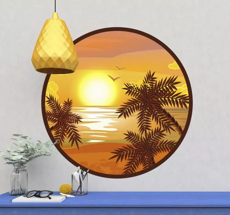 Transform your space with our stunning Nature wall sticker serene sunset view, featuring a beautiful circular design that showcases palm trees swaying gently by a tropical beach. This captivating piece captures the essence of a serene sunset over the ocean, bringing the tranquility of nature right into your home!