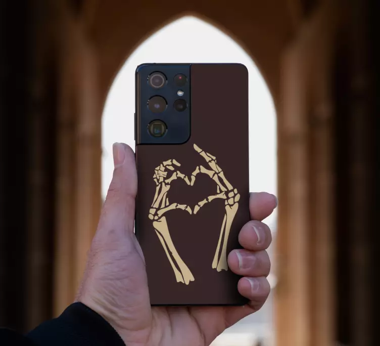 Elevate your style with our Samsung stickers skeleton heart gesture! These unique stickers feature a captivating graphic design showcasing a smartphone, skeleton hands forming a heart, and an expression of love. Perfect for those who want to add a touch of personality to their devices, these stickers are not just decorative; they reflect your vibe!
