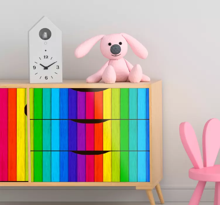 Introducing our Shape sticker with bright vertical stripes, a stunning design that features vibrant, multicolor stripes reminiscent of a rainbow cascading across wooden planks. This abstract pattern beautifully mimics a wood-effect finish, making it an eye-catching addition to any furniture or space. The combination of bright colors and a playful design brings a sense of joy and creativity to your decor!
