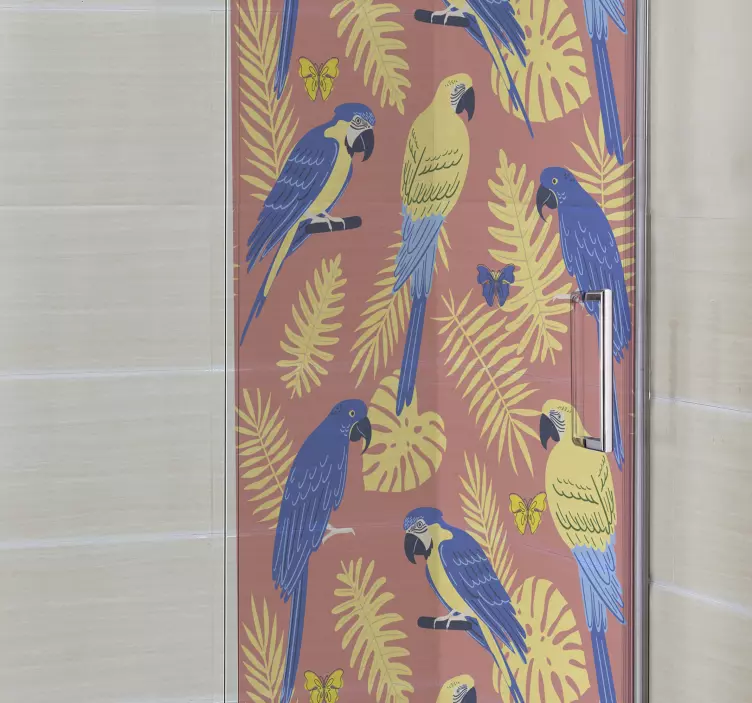 Introducing our vibrant Shower screen sticker colorful parrots design, a true feast for the eyes! This stunning design features bold macaws, lush leaves, and delicate butterflies, all set against a backdrop of tropical nature. The bright yellow and blue hues create a lively atmosphere, making it perfect for any bathroom. The parrots and leafy patterns will transport you to a tropical paradise every time you step into your shower!