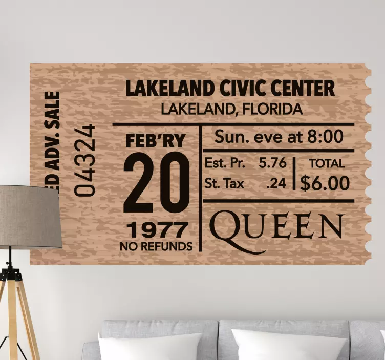 Reference: A49733A vintage ticket from the Lakeland Civic Center, featuring an event by Queen on February 20, 1977. This design highlights the historical significance of live music events, showcasing ticket details such as location, date, and pricing, appealing to music enthusiasts and collectors.