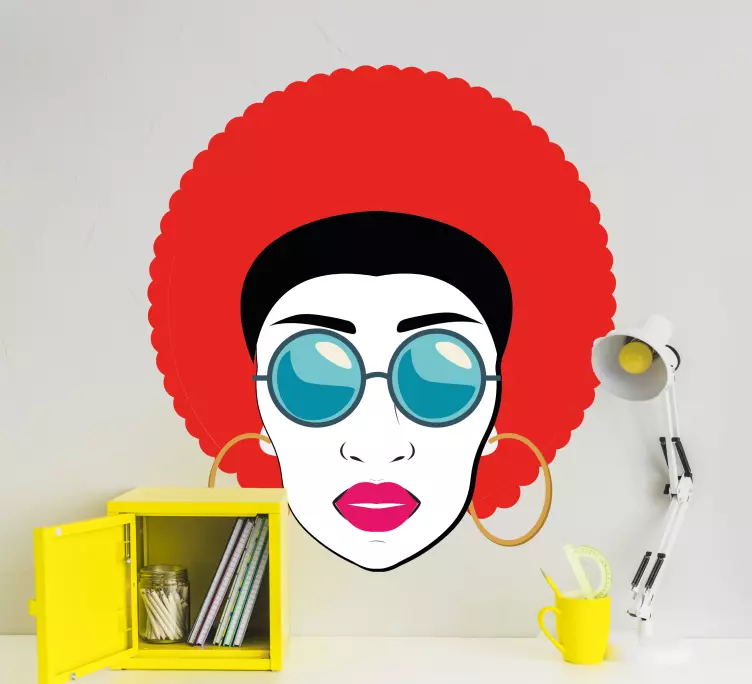 The Wall sticker bold afro portrait showcases a vibrant and eye-catching design featuring a stunning woman with an afro hairstyle, stylishly adorned with sunglasses and colorful accessories. This beautiful illustration captures the essence of femininity, making it a perfect addition to any space that needs a touch of personality!