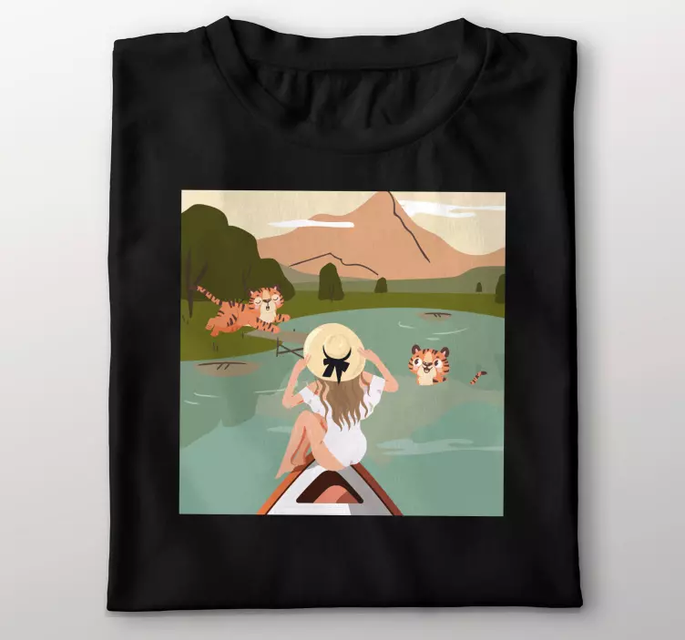 Embrace the wild spirit of nature with our Adventure with tigers t-shirt! This stunning design features a playful girl surrounded by majestic tigers in a vibrant illustration. The cartoon style showcases a serene lake and lush nature, inviting you to relax by the water while enjoying the beauty of these magnificent animals. Perfect for those who love the outdoor lifestyle, this t-shirt captures the essence of adventure and tranquility in one captivating scene.