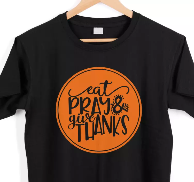 Experience a unique aesthetic during the autumnal holidays with this custom t-shirt. Customize your wardrobe with this design or get multiple shirts to match with your family during dinner. The elegant calligraphy font in black text on an orange circle shows important verbs used during the Thanksgiving period: eat, pray, and give thanks to others. This shirt is a reminder to be thankful during the holiday season.