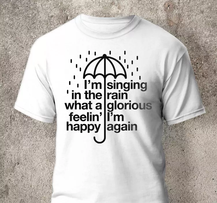 Reference: T4934This design features a cheerful umbrella surrounded by raindrops, complemented by uplifting text. It captures a joyful spirit, encouraging positivity even in gloomy weather. The stylish typography adds a playful touch, making it perfect for anyone looking to express their love for life and music.