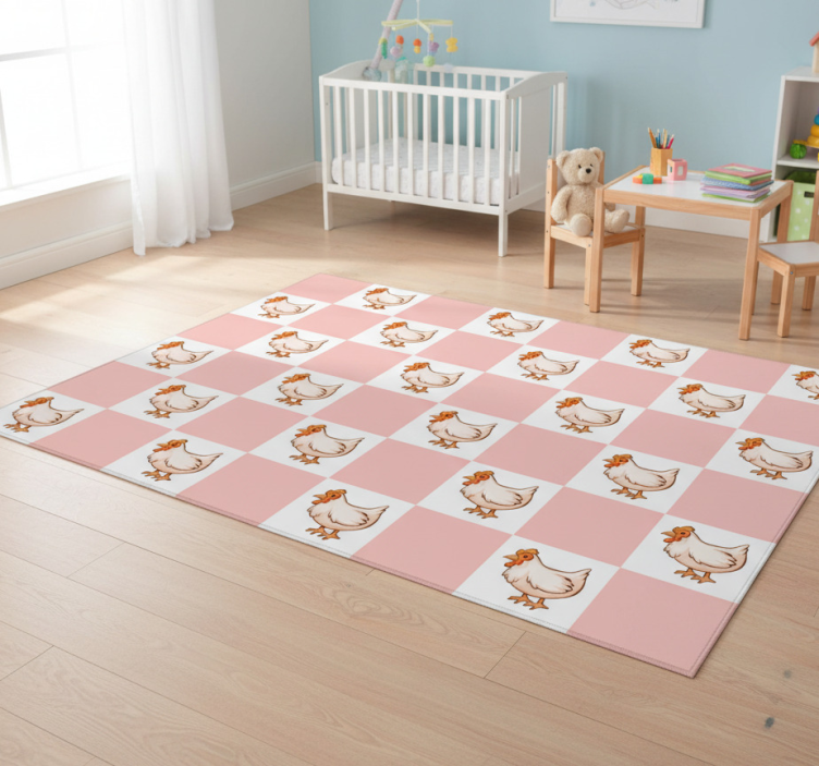 Caring for your Animal vinyl rug pink rooster checkered design animal vinyl rug is a breeze! Simply wipe it down with a damp cloth or use a mild detergent for tougher stains. Its durable material ensures that it stays looking fresh and vibrant, making maintenance easy and hassle-free!