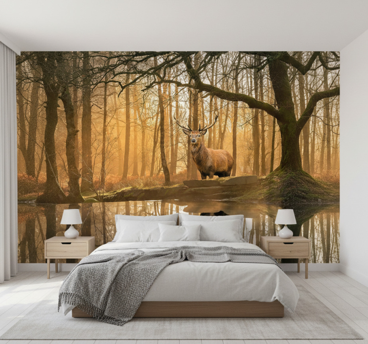 Reference: F11939Transform your space with our stunning Forest wall mural golden stag lake, an enchanting design that captures the serene beauty of nature. This captivating mural features a majestic golden stag gracefully poised by a tranquil lake, surrounded by lush forest scenery. The soft, matt colors enhance the calming atmosphere, making it perfect for any room in your home.