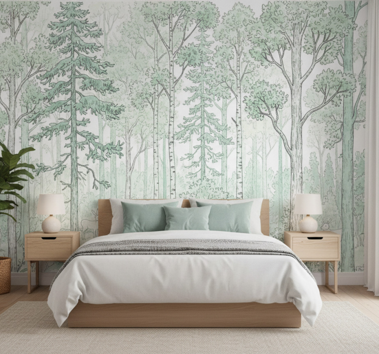Reference: F11929Transform your space with our stunning Forest wall mural mint woodland illustration, a captivating design that brings the serene beauty of nature indoors. Featuring a harmonious blend of soft mint hues and intricate woodland elements, this mural evokes a sense of tranquility and wonder. The matt colors create a soothing atmosphere, while the non-woven wallpaper ensures durability and ease of application. Perfect for any room, this design invites the charm of the forest into your home!