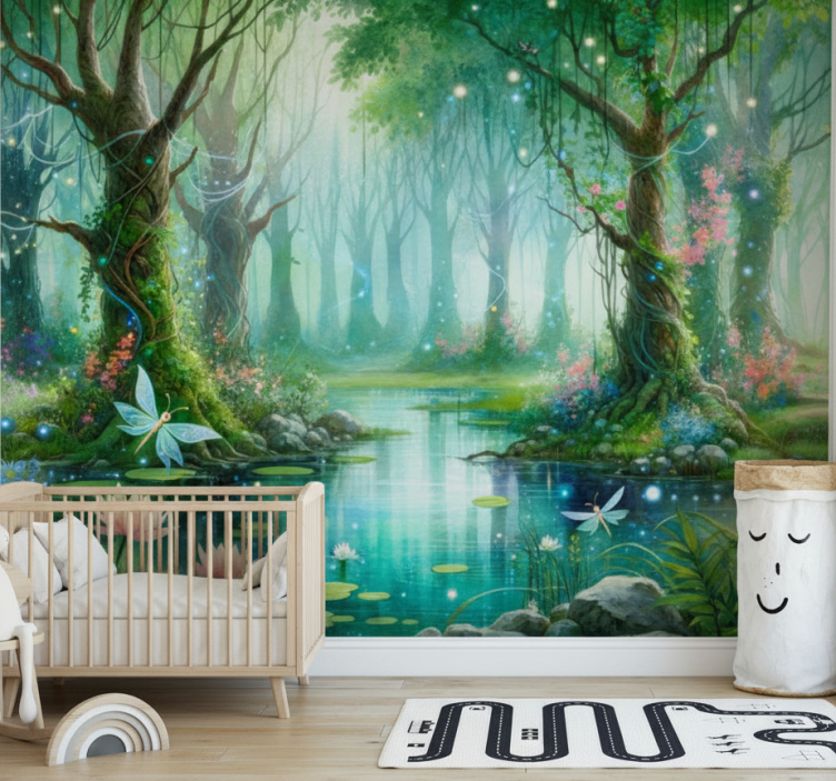 Reference: F11950Transform your space with our Forest wall mural whimsical fairy design, a delightful creation that captures the enchantment of nature. This mural features a magical forest landscape, filled with whimsical fairies dancing among lush trees and vibrant foliage. The soft, matt colours create a serene atmosphere, making it perfect for any room in your home.